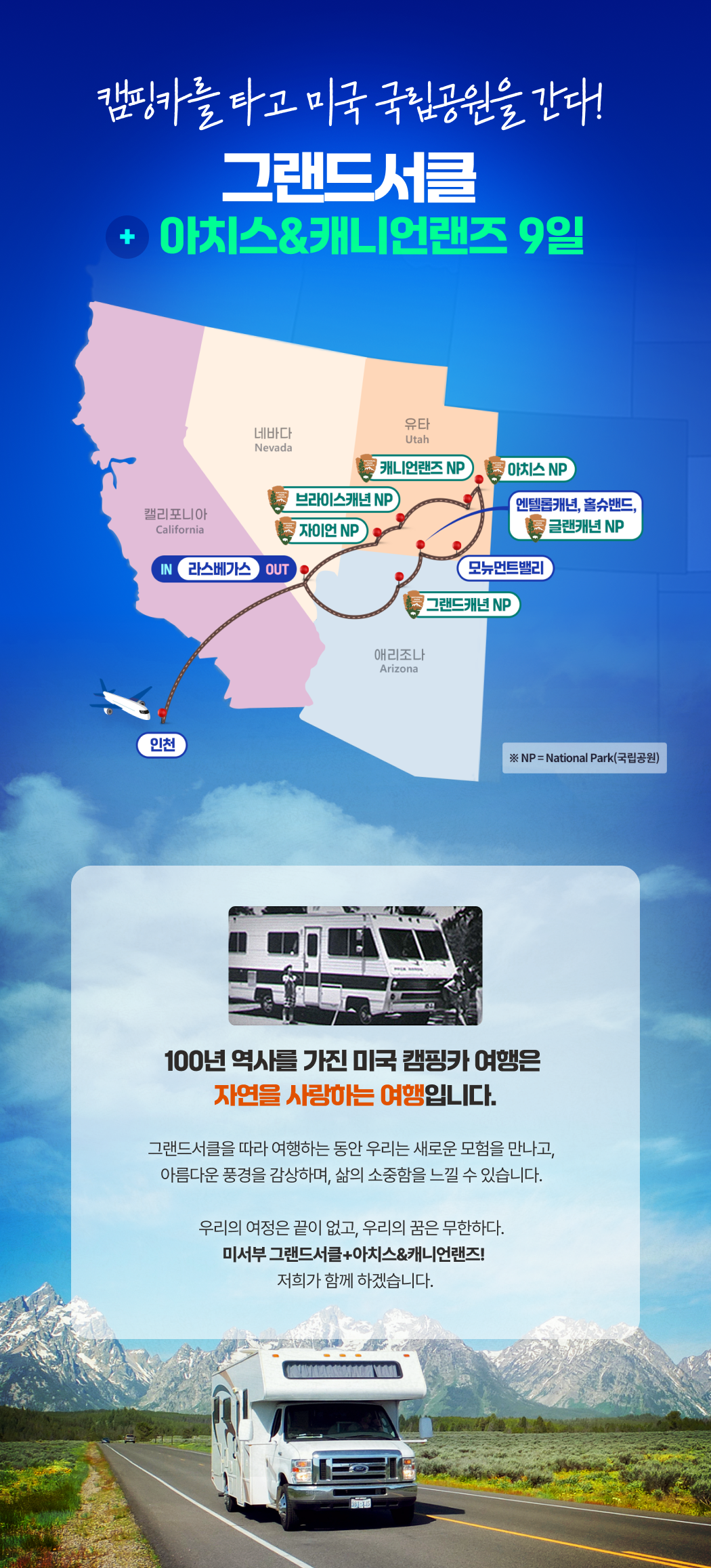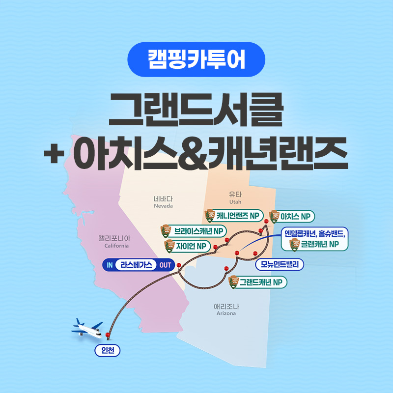 • 기상 후 그랜드 캐년 일출 포인트 이동 및 일출 감상 • 일출 감상 후 그랜드캐년 이스트림으로 이동 - 약 45분 소요 • 그랜드캐년 주요 포인트 추가 방문 후 이스트림으로 이동 - 약45분 • 그랜드캐년 이스트림 데져트 뷰 와치타워 방문 • 와치타워 방문 후 엔탈롭캐년으로 이동 - 약 2시간 20분 • 엔탈롭캐년 도착 후 투어 *엔탈로프 예약 시간에 따라 순서가 변경될 수 있습니다. ◈ 앤텔로프 캐년(Antelope Canyon) 투어 ** 옵션투어:$73 현지 지불 ** 로워 앤텔로프 트레일(Lower Antelope Trail) 진행 - 약 1.6km / 도보 1시간 30분 소요 - 모래가 빚어낸 놀라운 사암 협곡, 빛이 들어올때마다 시시각각 변하기 때문에 놀라운 광경을 만듭니다. • 엔탈롭캐년 투어 후 홀스슈 벤드로 이동 - 약 15분 • 홀슈밴드 도착 후 트레일 하이킹 ◈ 홀슈벤드 트레일(Horseshoe Bend Trail) 하이킹 하이킹 시간 - 45분 / 길이 - 왕복 2.2km / 난이도 - 초급 - 거대한 홀스슈벤드를 만나러 가는 가벼운 트레일입니다. - 선크림, 모자 필수이며 여름철에는 특히 물이 필수 입니다. • 홀슈밴드 방문 후 미국 월마트(Wal Mart)방문 및 석식 • 석식 후 캠핑장으로 이동 - 약 30분 소요 • 캠핑장 도착 후 휴식 |