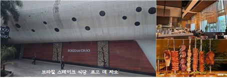 여행 중 식사도 그 지역을 대표하는 특이한 음식들을 경험할 수 있도록 최대한 배려를 아끼지 않았다. 특히 여행을 마무리하며 들린 브라질 스테이크 식당 ‘포고 데 차오(Fogo de Chão)’는 리오 데 자네이로에서 최고급 식당으로 평가받는다고 가이더가 소개하였는데, 소요 경비 문제로 처음에는 여행사 측에서도 주저하였지만, 여행의 퀄리티를 높이기 위해 결단하였다고 한다. 어찌 되었든 식당의 위치며 분위기, 그리고 음식의 질적인 면은 여행을 마무리하는 차원에서는 유종의 미를 거두었다고 생각한다. 다시 한번 세심한 배려를 아끼지 않은 여행사와 길잡이 및 지역 전문 가이드의 친절하고도 적극적인 안내, 그리고 끝까지 서로 배려하고 협조하여 별 탈 없이 여행을 마치도록 한 동료들에게 감사드린다.