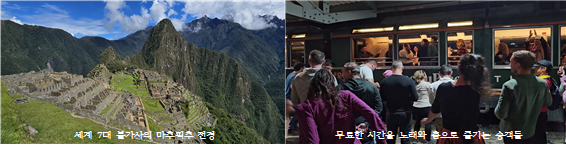 페루하면 제일 먼저 떠오르는 것이 마추픽추(Machu picchu)일 것이다. 세계 7대 불가사의 중 하나로 손꼽히는 세계적인 명소를 다행히 날씨 복이 있어 제대로 구경할 수 있었는데, 옥의 티라고 할까 예상치 못한 열차 탈선 사고로 모든 열차의 운행이 한동안 중지되는 바람에 8시간 동안 열차 안에 감금되어 한밤중에 호텔로 돌아오게 되었다. 그러나 세계 각지에서 몰려든 관광객 중 누구 하나 불평하는 사람 없이 오히려 춤과 노래로 무료한 그 시간을 즐기는 모습이 무척 인상적이었다.