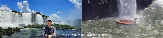 이과수 폭포는 브라질과 아르헨티나 국경지역에 위치해 악마의 목구멍이란 가장 큰 폭포는 아르헨티나 지역에서 보아야 하지만, 전체적인 웅장한 폭포의 전경은 브라질 쪽이 압도적이다. 이러한 이유로 연간 방문객도 브라질 쪽이 아르헨티나보다 100만 명이 더 많다고 한다. 이과수 폭포의 장관을 가까이서 체험해 보기 위해 보트 투어를 했는데, 가이드의 특별 주문으로 인해 엄청난 물 폭탄을 맞은 것도 즐거운 추억의 하나라고 말해야 할 것 같다.