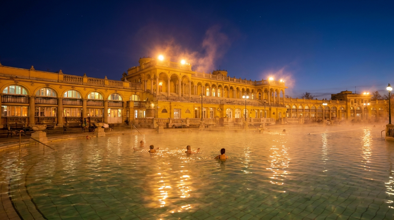 트래블러스맵 상품에는 부다페스트 다뉴브강 야경 유람선 탑승권이 포함되어 있습니다. 국회의사당, 세체니 다리, 어부의 요새가 한눈에 들어오는 이 밤 풍경은, 인솔자로 여러 번 와도 매번 휴대폰을 다시 꺼내 들게 되는 장면입니다. - 온천 문화 – 세체니 온천