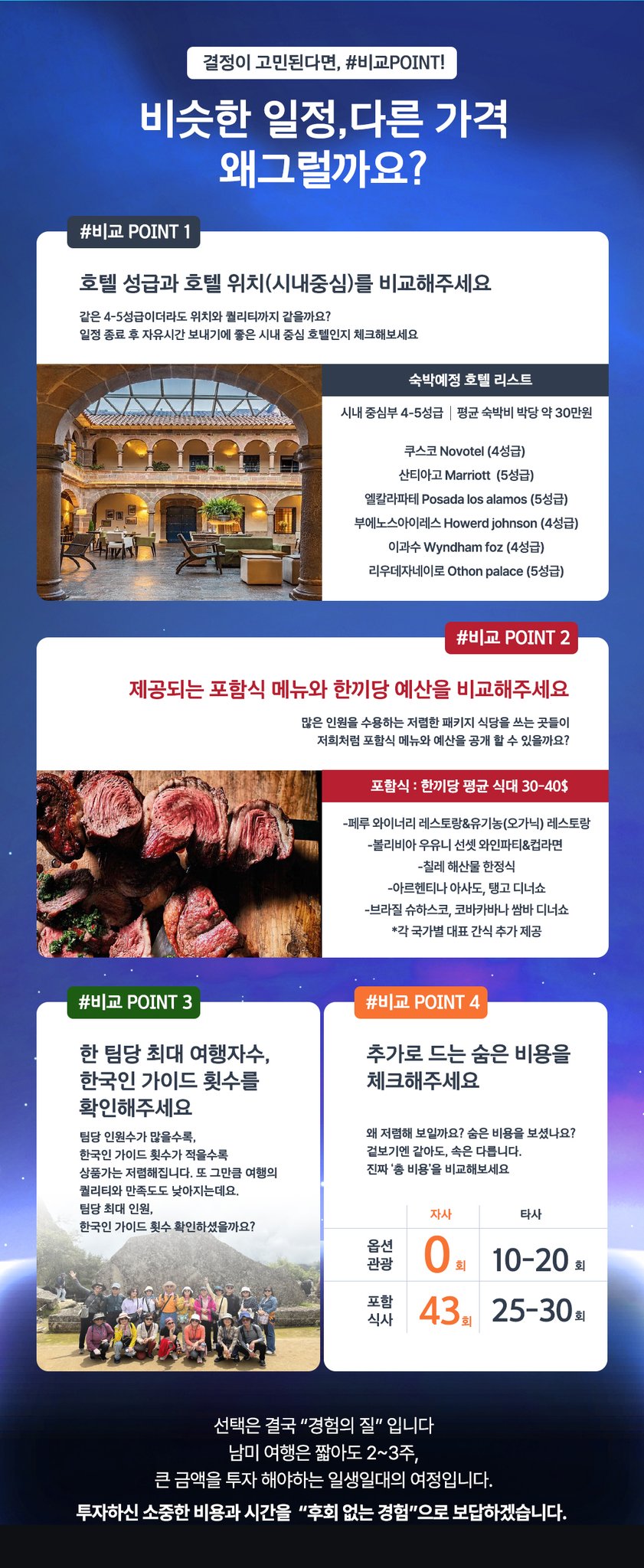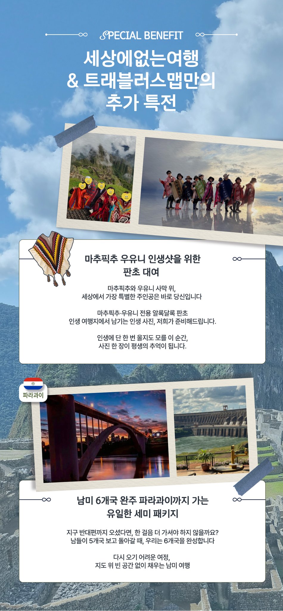 남미지도 위 빈칸 없이 완주하는 단 한번의 여정 - 페루 마추픽추, 볼리비아 우유니 소금사막, 파타고니아(토레스 델 파이네, 페리토 모레노 빙하, 피츠로이 트레킹), 칠레 산티아고, 아르헨티나 부에노스 아이레스, 이과수 폭포(아르헨티나, 브라질), 파라과이 이따이푸댐, 브라질 리우데 자네이루를 한번에 경험하세요.