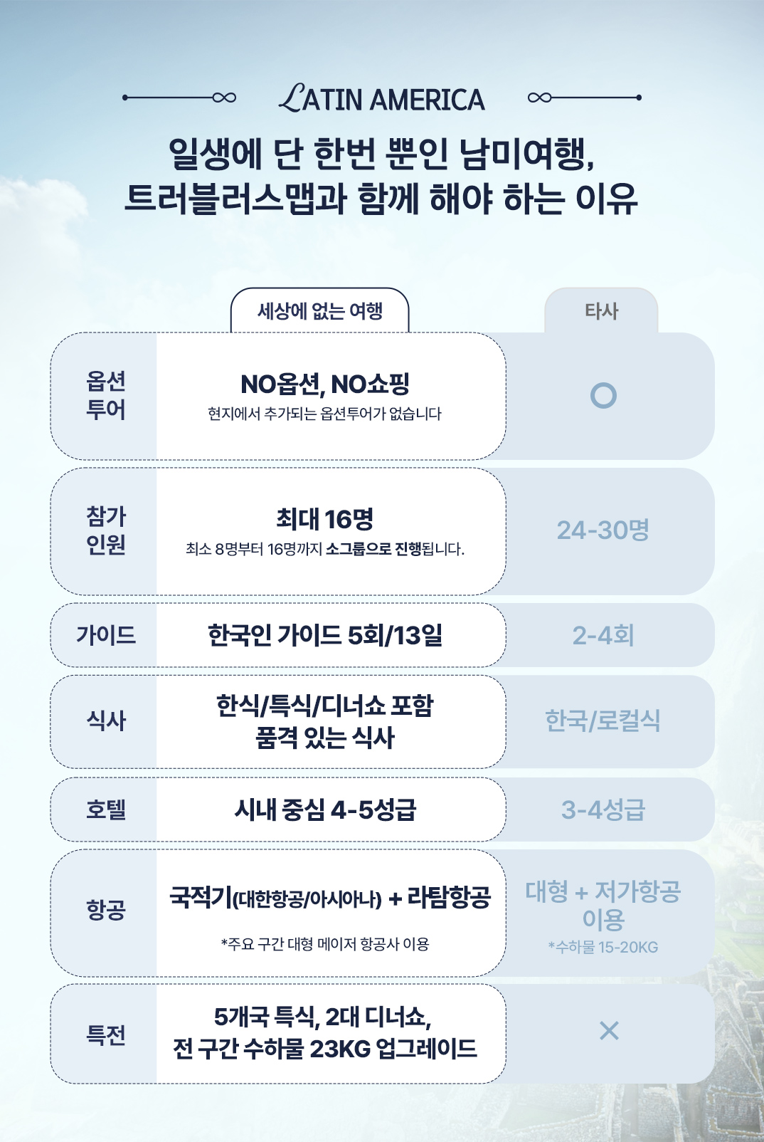 남미 내 구간항공 9회 포함, 총 13회 항공 이동 모두 수하물 23kg 업그레이드 보장 - 넉넉한 수하물로 장기여행의 불편을 확 줄였습니다.