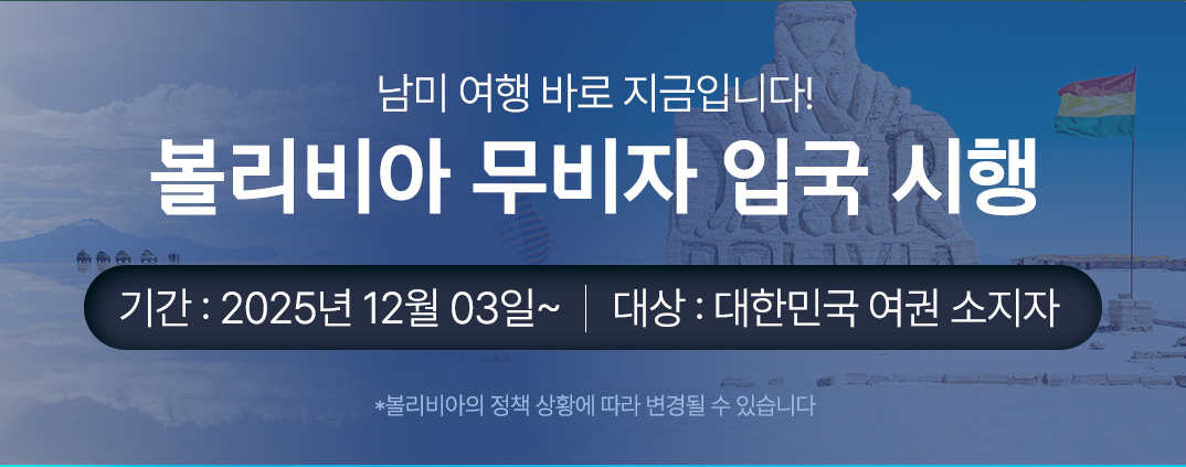 한국 여권 기준으로 페루·칠레·아르헨티나·브라질·파라과이 대부분 관광 목적 단기 체류는 무비자 입국이 가능합니다. 볼리비아는 국적에 따라 전자비자나 도착비자가 필요할 수 있어 사전 확인이 필요합니다. 또한 경유로 미국을 이용할 경우 ESTA(ESTA 비용 별도)가 필요할 수 있으니 항공 경로 확정 시 약 90일 전 비자 안내를 드립니다. 여권은 귀국일 기준 최소 6개월 이상 유효기간과 빈 여권 페이지(입국 스탬프용) 2장 이상 권장합니다. 볼리비아 비자·미국 ESTA 대행은 별도 신청 가능하니 예약 시 알려주시면 대행 안내해 드립니다.