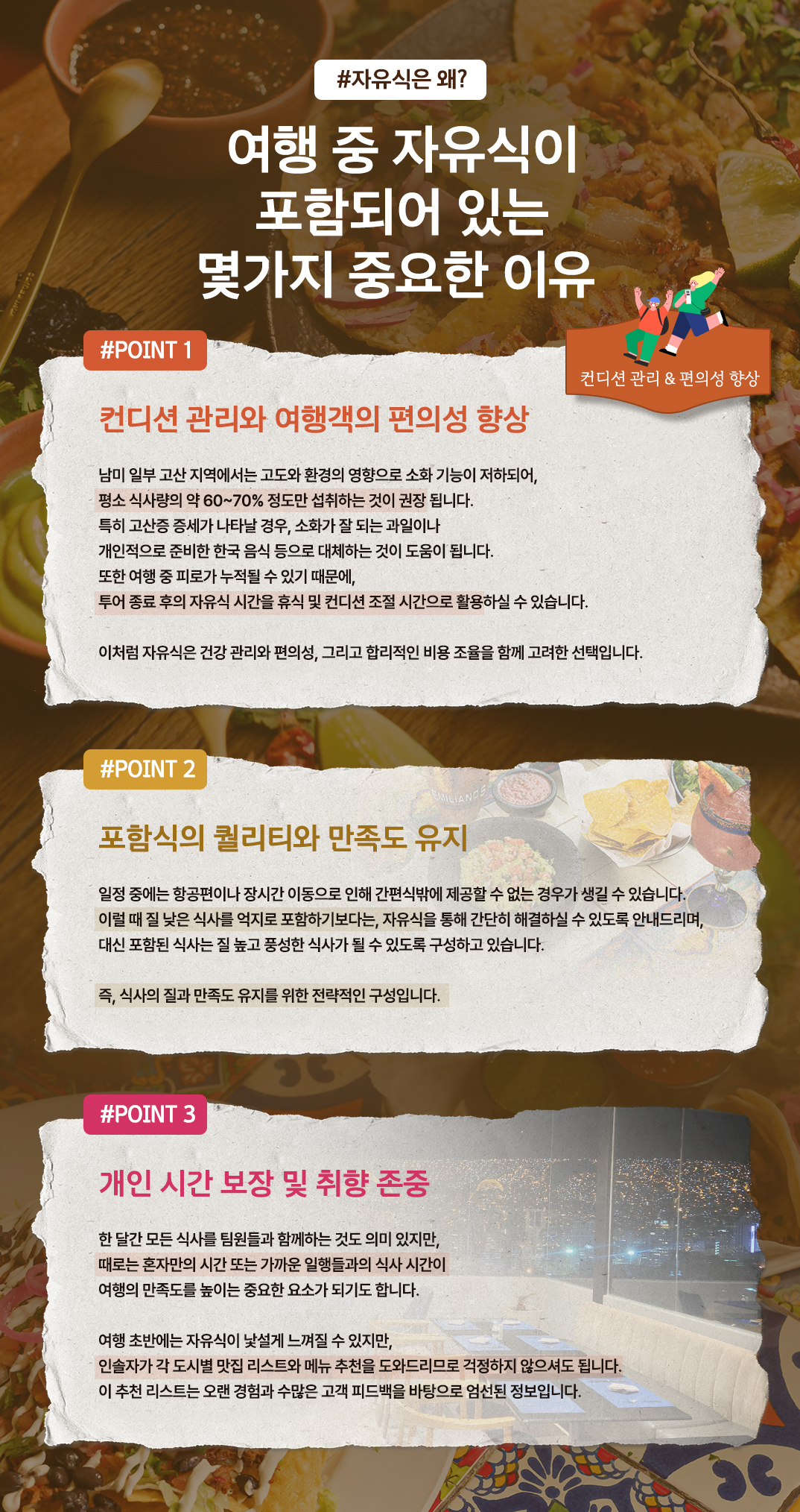 - 기내에서 여유롭게 휴식을 취하며 앞으로의 27일간 남미 여정을 상상해 보세요. 시차가 크기 때문에 물을 자주 마시고 가벼운 스트레칭으로 몸의 피로를 풀어주는 것이 좋습니다.