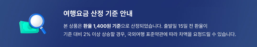 - 환율 기준: 출발 15일 전 환율이 1달러당 1,400원 이상일 경우, 잔금에 환율 변동분 반영