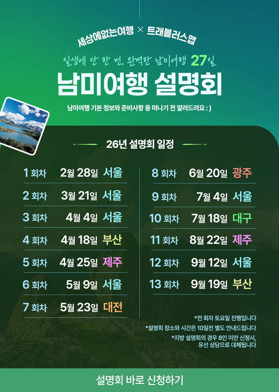 남미지도 위 빈칸 없이 완주하는 단 한번의 여정 - 페루 마추픽추, 볼리비아 우유니 소금사막, 파타고니아(토레스 델 파이네, 페리토 모레노 빙하, 피츠로이 트레킹), 칠레 산티아고, 아르헨티나 부에노스 아이레스, 이과수 폭포(아르헨티나, 브라질), 파라과이 이따이푸댐, 브라질 리우데 자네이루를 한번에 경험하세요.
